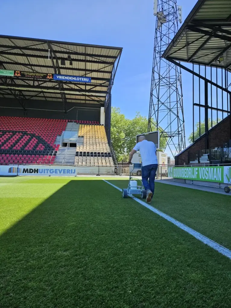 Bij veel clubs is het trekken van lijnen op het voetbalveld iets wat ‘er even tussendoor moet’. Met een versleten lijnentrekker voor het voetbalveld en een blik verf proberen vrijwilligers op het oog rechte lijnen aan te brengen. Het resultaat? Inconsistente belijning, verspilde tijd en een veld dat er rommelig uitziet. En dat terwijl een goede belijning de basis vormt voor elke wedstrijd.